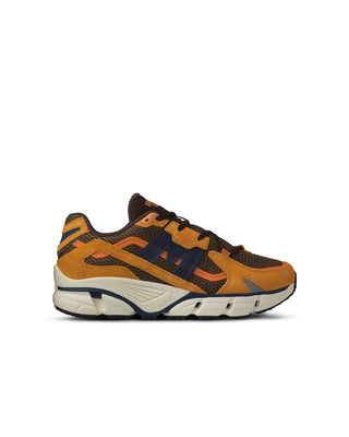 Le design de l’empeigne s’inspire des modèles performance archivés de Karhu, exprimés à travers une silhouette retro inspired aux proportions modernes. Le coloris Nugget et Navy Peony apporte chaleur et profondeur en combinant des tons terreux avec un contraste subtil. Il s’associe facilement avec du technical outerwear, du denim ou du streetwear décontracté. Le design reste intentionnel et épuré, renforçant le caractère fonctionnel de la Super Fulcrum.